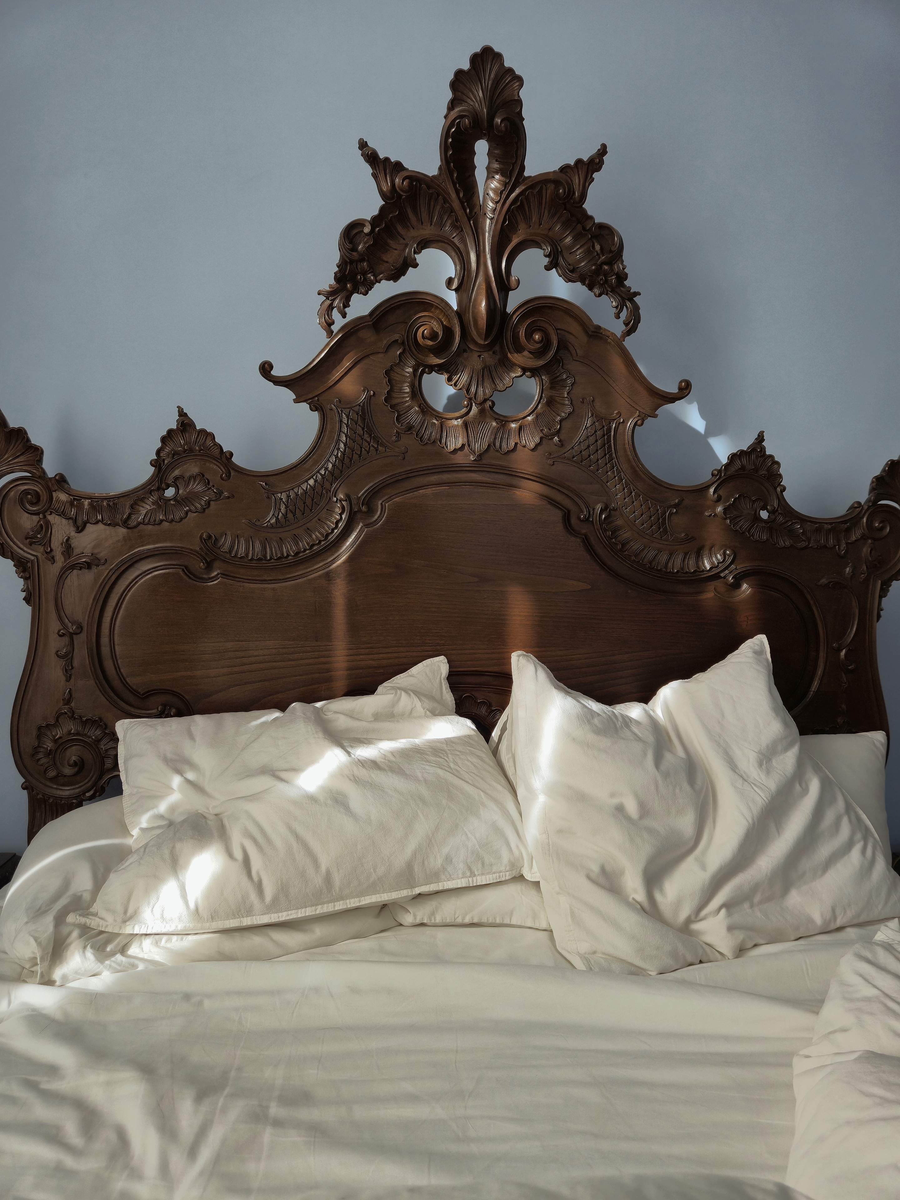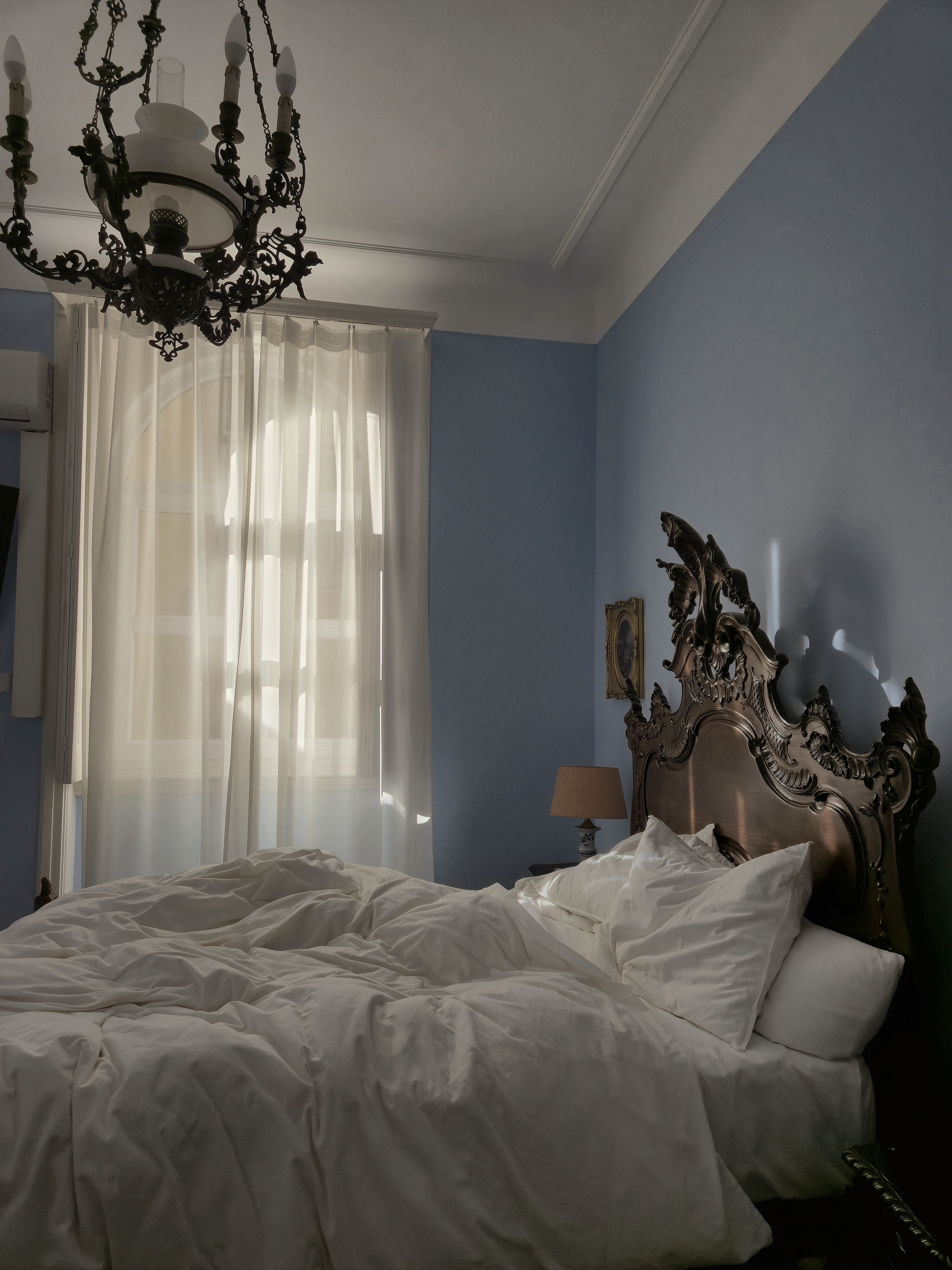 The walls are painted in a soft blue tone, which works well with the natural light coming through the windows. The room feels bright and easy to inhabit throughout the day, without unnecessary decoration.